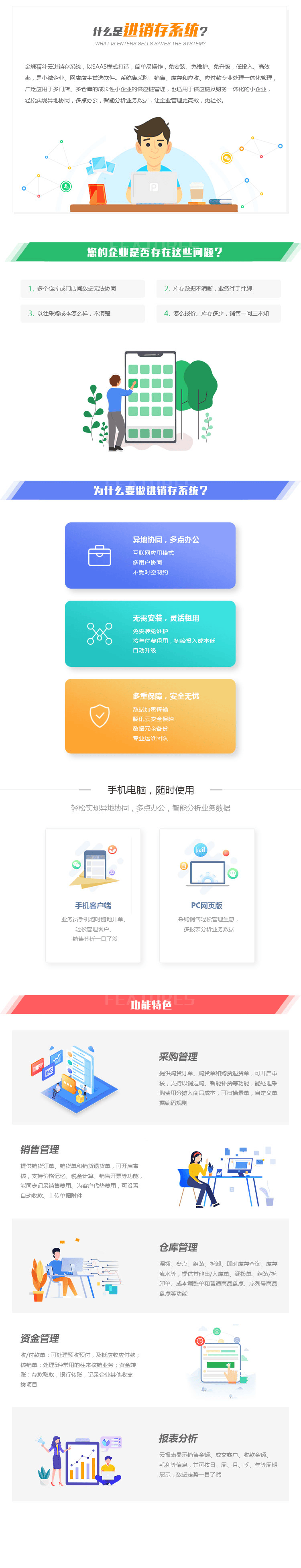 进销存系统,以SAAS模式打造,简单易操作,免安装、免维护、免升级,低投入、高效率,是小微企业、网店店主首选软件。系统集采购、销售、库存和应收、应付款专业处理一体化管理,广泛应用于多门店、多仓库的成长性小企业的供应链管理,也适用于供应链及财务一体化的小企业,轻松实现异地协同,多点办公,智能分析业务数据,让企业管理更高效,更轻松。