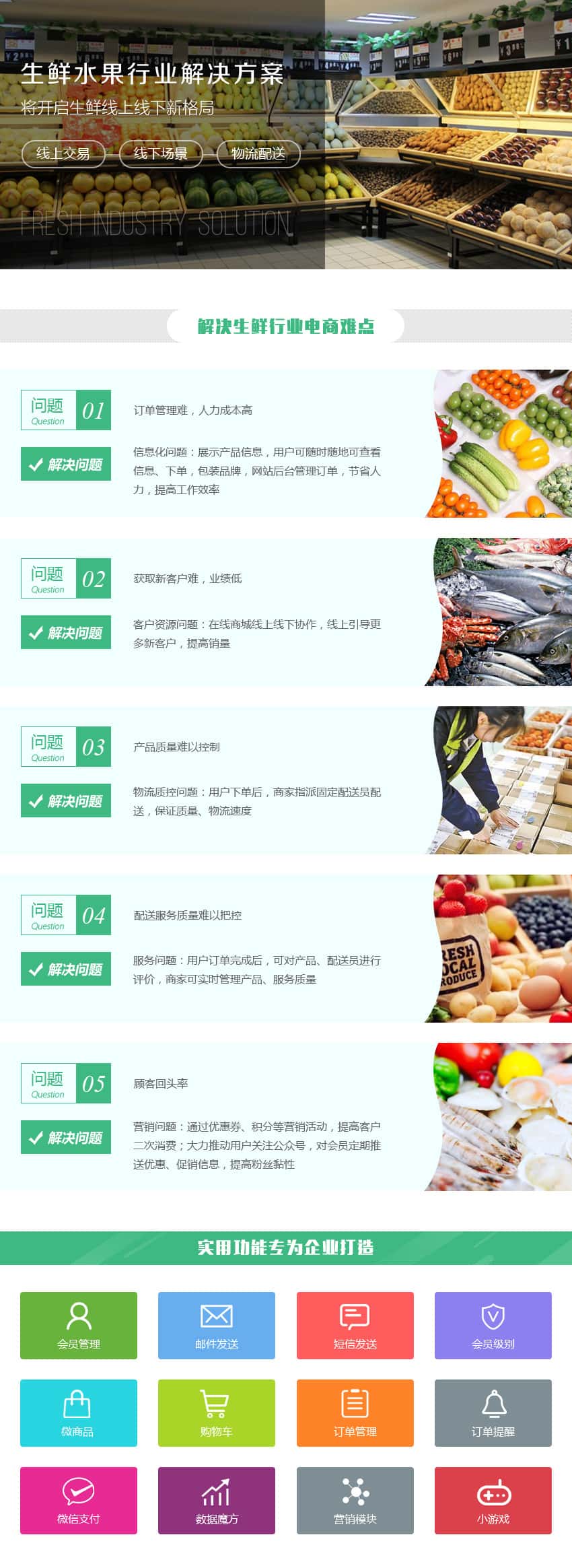 会员管理、邮件发送、短信发送、会员级别、微商品、购物车、订单管理、订单提醒、微信支付、数据魔方、营销模块、小游戏